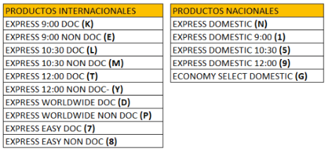 - Internacionales: Express Worldwide doc (D) y Express Worldwide nondoc (P) Express Worldwide Import™ Doc (D), Express Worldwide Import™ NonDoc (P)