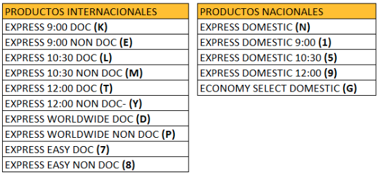 - Internacionales: Express Worldwide doc (D) y Express Worldwide nondoc (P) Express Worldwide Import™ Doc (D), Express Worldwide Import™ NonDoc (P)